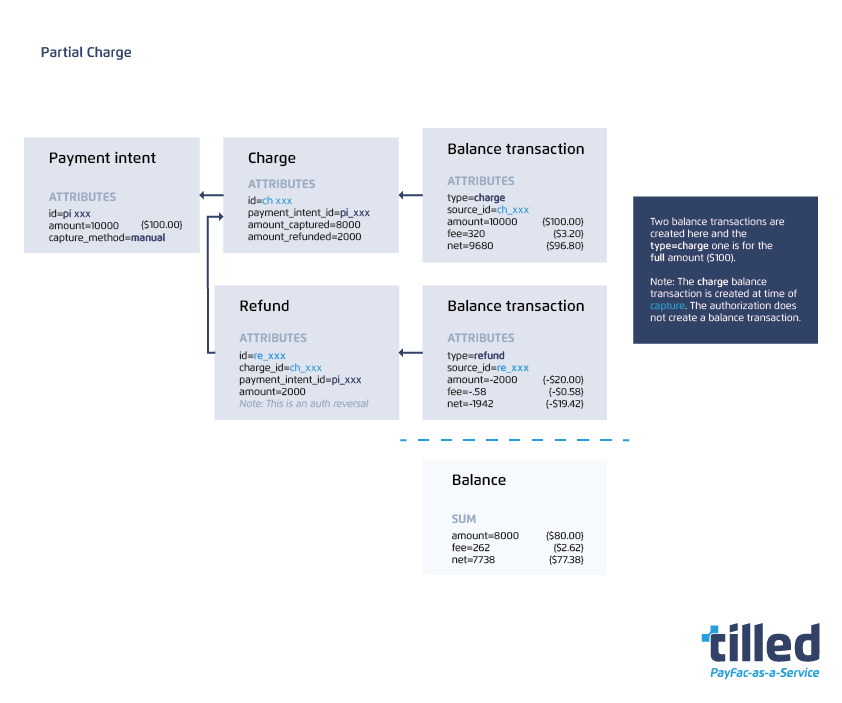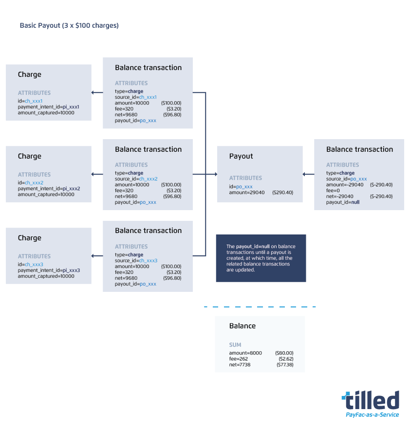 A source_id field in balance transactions contains the ID of the related Tilled object. The API can be used to obtain more information about the payment activity that resulted in the creation of the Balance transaction. For example, if the type of a given Balance transaction is type=charge and the source_id=ch_123..., you could get the charge details from this request by passing in the charge ID (ch_123...).