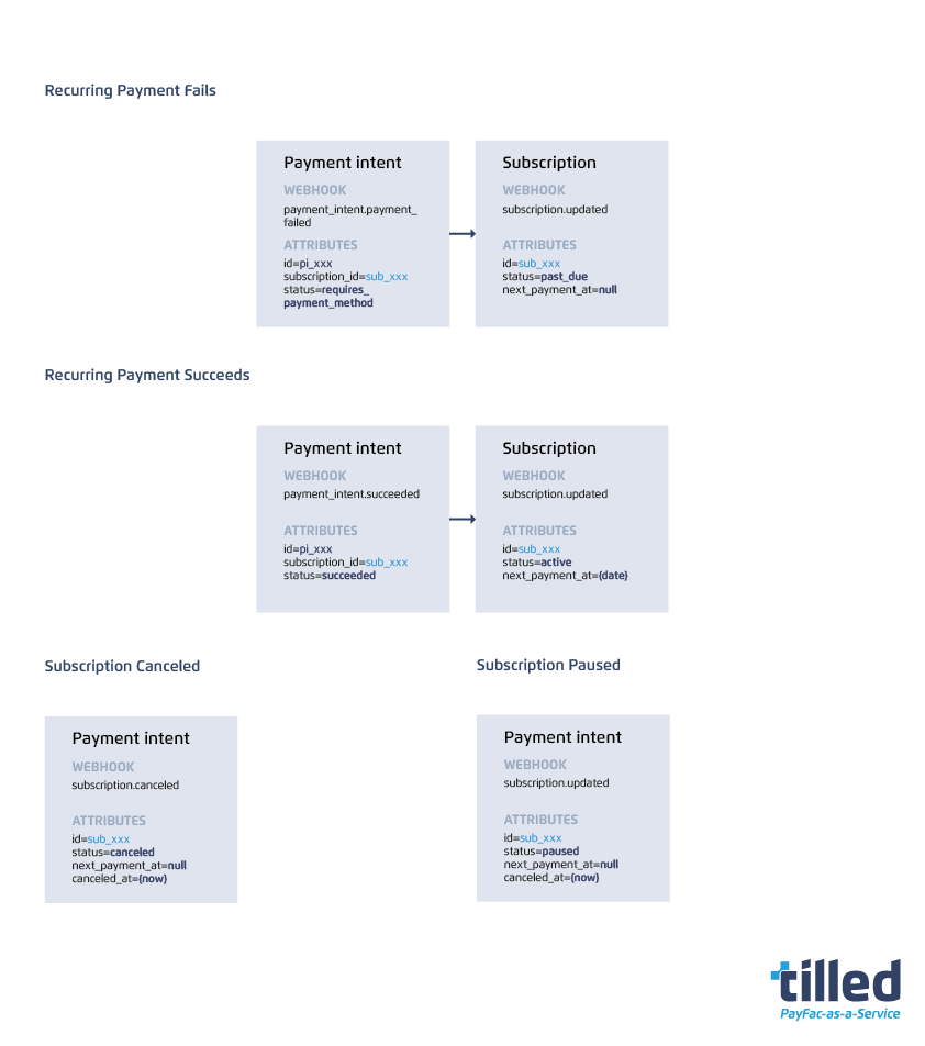 The PaymentIntent tracks the lifecycle of every payment. Whenever a payment is due for a subscription, Tilled generates a PaymentIntent. The state of the PaymentIntent affects the state of the subscription.