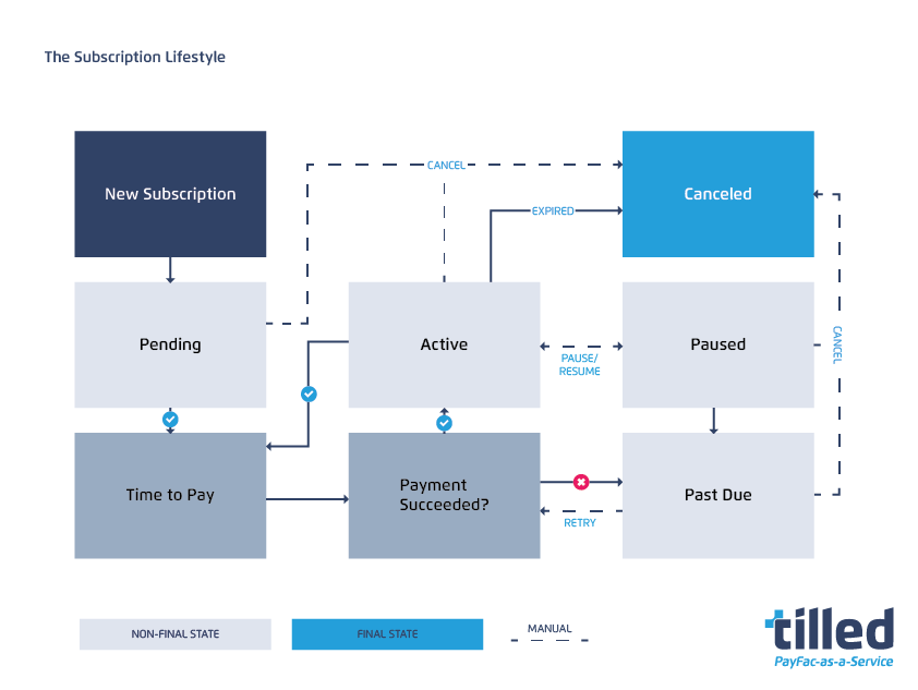 Automatic payments are only attempted during the pending and active statuses. Tilled will not attempt automatic payments during paused, past_due, or canceled statuses.